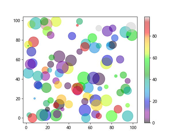 # 以下三行代码使编译器支持绘图功能: import sys import matplotlib matplotlib.use('Agg') import matplotlib.pyplot as plt import numpy as np # 生成随机数据: x = np.random.randint(100, size=(100)) y = np.random.randint(100, size=(100)) colors = np.random.randint(100, size=(100)) sizes = 10 * np.random.randint(100, size=(100)) # 点大小(10-990随机值) # 使用光谱配色、半透明效果创建散点图: plt.scatter(x, y, c=colors, s=sizes, alpha=0.5, cmap='nipy_spectral') plt.colorbar() plt.show() # 以下两行代码使编译器能够输出图形: plt.savefig(sys.stdout.buffer) sys.stdout.flush()