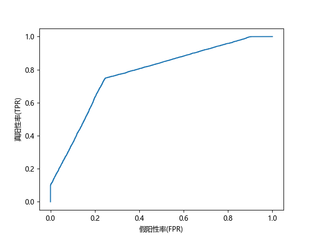 # 这三行代码使编译器支持绘图功能: import sys import matplotlib matplotlib.use('Agg') import numpy as np import matplotlib.pyplot as plt from sklearn.metrics import accuracy_score, confusion_matrix, roc_auc_score, roc_curve n = 10000 y = np.array([0] * n + [1] * n) # 生成两种概率预测值: y_prob_1 = np.array( np.random.uniform(.25, .5, n//2).tolist() + np.random.uniform(.3, .7, n).tolist() + np.random.uniform(.5, .75, n//2).tolist() ) y_prob_2 = np.array( np.random.uniform(0, .4, n//2).tolist() + np.random.uniform(.3, .7, n).tolist() + np.random.uniform(.6, 1, n//2).tolist() ) def plot_roc_curve(true_y, y_prob): """ 根据预测概率绘制ROC曲线 """ fpr, tpr, thresholds = roc_curve(true_y, y_prob) plt.plot(fpr, tpr) plt.xlabel('假阳性率(FPR)') plt.ylabel('真阳性率(TPR)') # 绘制第一种概率预测的 ROC 曲线: plot_roc_curve(y, y_prob_1) # 这两行代码使编译器能够输出图形: plt.savefig(sys.stdout.buffer) sys.stdout.flush()