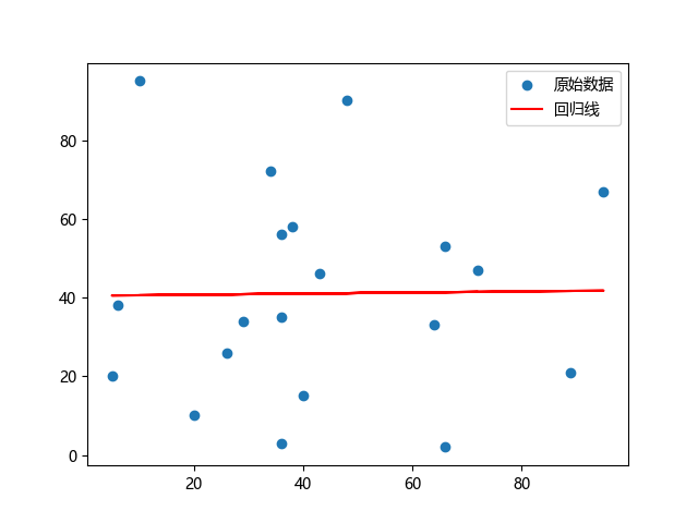 # 三行配置使编译器支持绘图功能: import sys import matplotlib matplotlib.use('Agg') import matplotlib.pyplot as plt from scipy import stats # 原始数据集: x = [89,43,36,36,95,10,66,34,38,20,26,29,48,64,6,5,36,66,72,40] y = [21,46,3,35,67,95,53,72,58,10,26,34,90,33,38,20,56,2,47,15] # 执行线性回归分析 # 斜率,截距,相关系数,p 值,标准误差: slope, intercept, r, p, std_err = stats.linregress(x, y) # 定义线性回归函数: def myfunc(x): return slope * x + intercept # y = kx + b # 生成回归线预测值: mymodel = list(map(myfunc, x)) # 绘制散点图和回归线: plt.scatter(x, y, label='原始数据') # 原始数据点 plt.plot(x, mymodel, color='red', label='回归线') # 回归直线 plt.legend() # 显示图例 plt.show() # 两行代码实现图形输出: plt.savefig(sys.stdout.buffer) sys.stdout.flush()