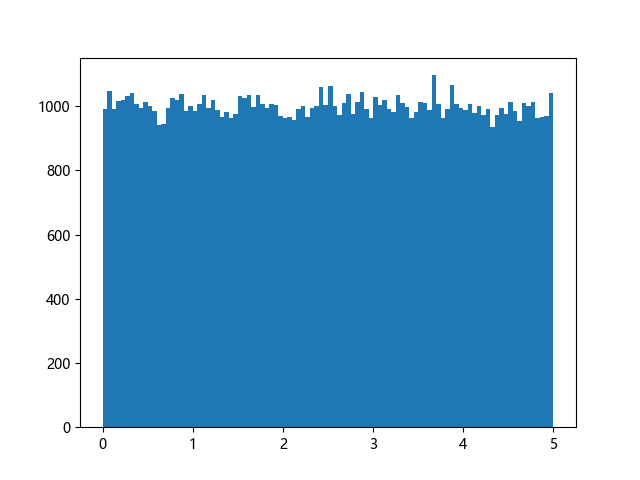 # 使编译器支持绘图的三行配置: import sys import matplotlib matplotlib.use('Agg') import numpy import matplotlib.pyplot as plt x = numpy.random.uniform(0.0, 5.0, 100000) plt.hist(x, 100) plt.show() # 实现编译器绘图功能的两行代码: plt.savefig(sys.stdout.buffer) sys.stdout.flush()