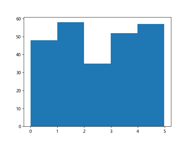 # 使我们的编译器能够绘制的三行代码: import sys import matplotlib matplotlib.use('Agg') import numpy import matplotlib.pyplot as plt x = numpy.random.uniform(0.0, 5.0, 250) plt.hist(x, 5) plt.show() # 使我们的编译器能够绘制的两行代码: plt.savefig(sys.stdout.buffer) sys.stdout.flush()