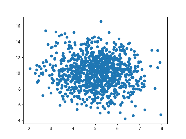 # 三行配置使编译器支持绘图功能: import sys import matplotlib matplotlib.use('Agg') import numpy import matplotlib.pyplot as plt # 生成正态分布数据:x~N(5.0,1.0),y~N(10.0,2.0),各 1000 个样本点: x = numpy.random.normal(5.0, 1.0, 1000) y = numpy.random.normal(10.0, 2.0, 1000) # 绘制散点图 plt.scatter(x, y) plt.show() # 两行代码实现图形输出: plt.savefig(sys.stdout.buffer) sys.stdout.flush()